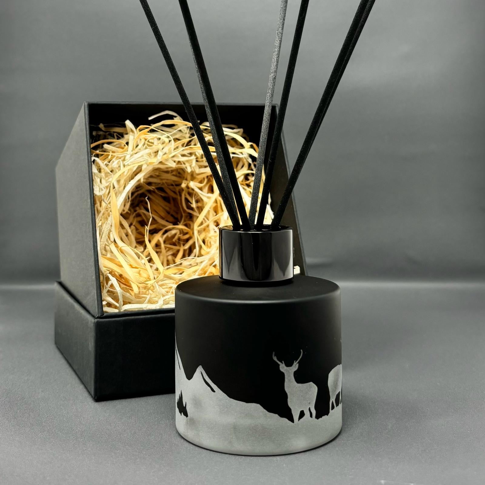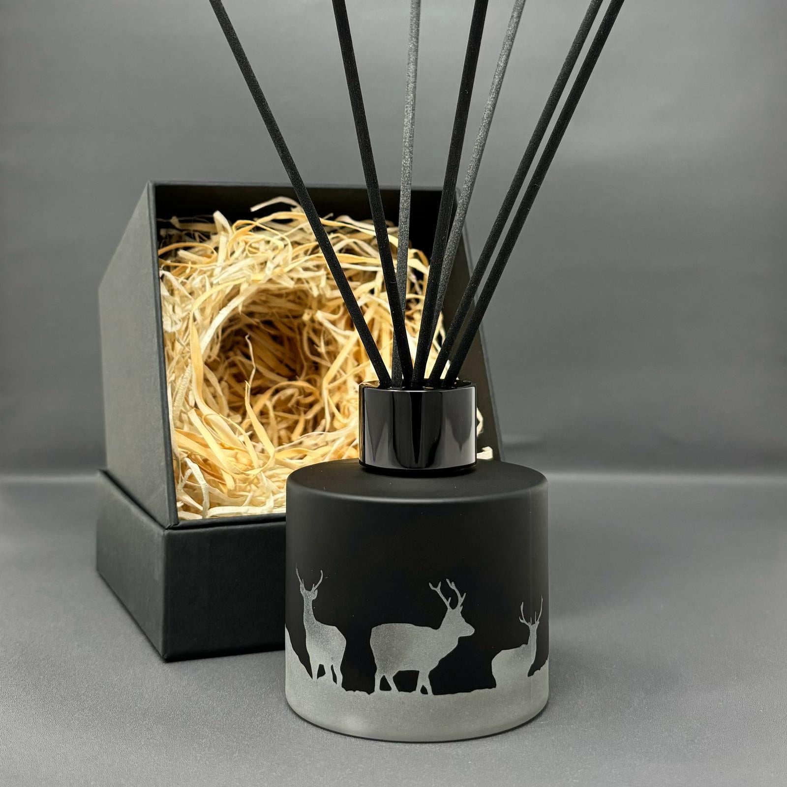 Black Glass Round Diffuser Bottle hand-etched with our striking stag design.